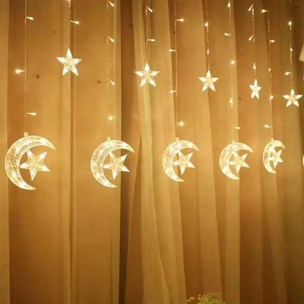 ✅تصميم الستارة مودرن جداً، بتنزل منها فروع بأطوال مختلفة فيها مجسمات هلال ونجوم شكلها رقيق وجذاب جدا